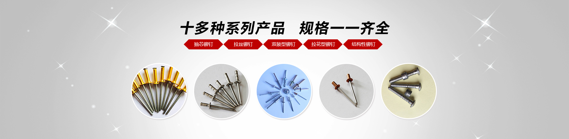 我們主要產品有:2.4-6.4的圓頭,沉頭(平頭),開口,封閉系列抽芯鉚釘(拉釘),還有燈籠鉚釘,拉絲鉚釘,雙鼓型鉚釘,拉花型鉚釘等等結構性鉚釘,材質有鋁,不銹鋼,鐵,銅;還有M3-M12的平頭,沉頭,小頭系列鉚螺母,有圓桿型、帶槽型、六角型(半六角)、盲孔型等,材質有鋁,不銹鋼,鐵,銅。